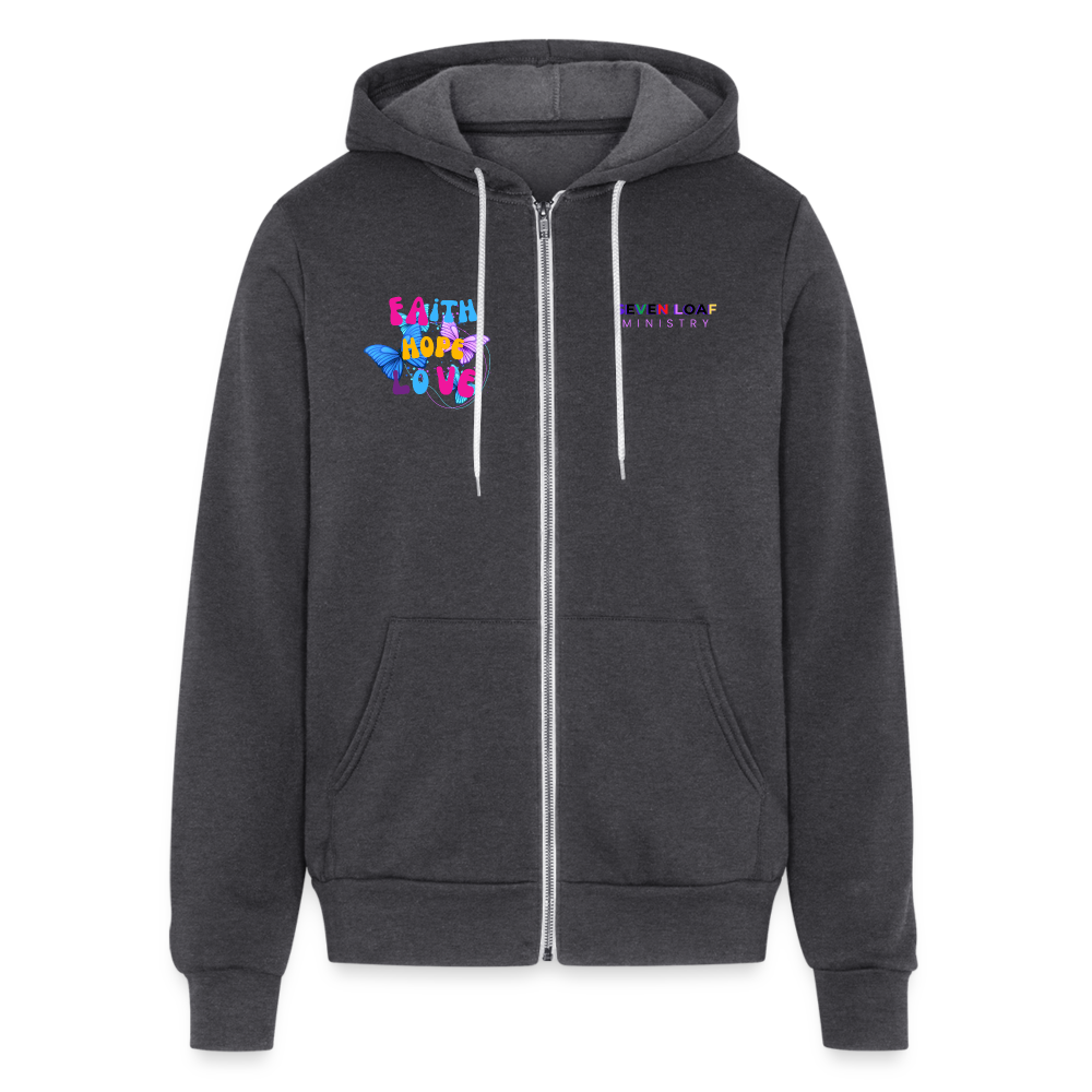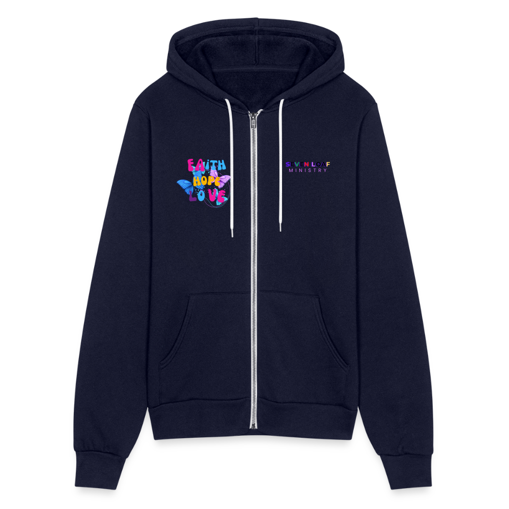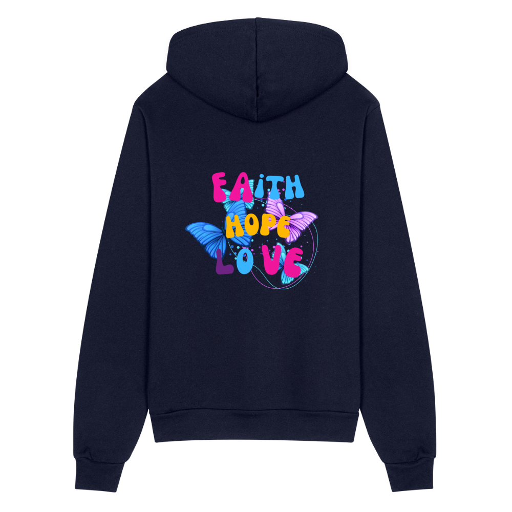 Introducing our "Faith, Hope, and Love" zip up hoodie, where timeless wisdom meets contemporary style. Inspired by the profound words of the Apostle Paul in the Bible, this sweatshirt encapsulates the essence of faith, hope, and love, overlaying them with the delicate beauty of colorful butterflies and a hint of cosmic effects.